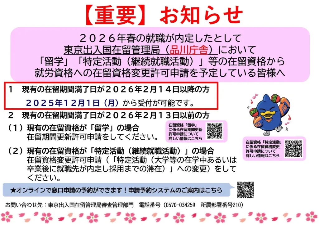 そのため東京入管では、2026年2月14日以降に在留期限を迎える方については、年内12月1日からその申請を受け付けるとの発表がありました。